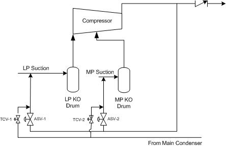 Quench control is used in close loop refrigerant applications (e.g. Propane/Propylene) where cooling of the hot recycle gas is achieved by liquid injection. The liquids used for quenching are produced by the refrigeration compressor operation itself and available through the discharge main condenser. Applications where a quench system is in place do not require any cooler for the ASV loop. Typical piping schematic for quench control relative to a single casing compressor with one side stream is depicted in Figure.