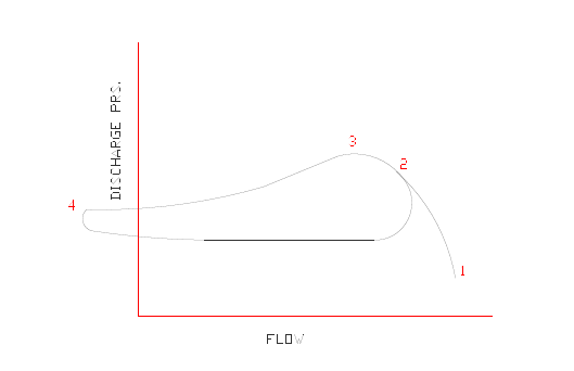 If the system resistance increases further, the discharge pressure becomes greater than the machine’s capability. This initiates a surge that spans between points 3 and 4. Flow may actually reverse through the compressor, as shown at point 4. A now reduced system resistance will allow increased flow back through the compressor that brings the operation back to point 2.