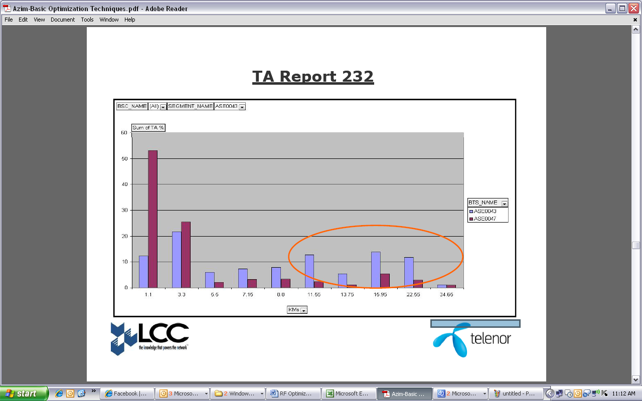 Use statistics for Timing Advance (TA, 1TA= 550m) as they give quite good indication of coverage foot print of the cell, hence, an indication of signal penetration in corresponding area. These stats can be extracted for xNokia cells from ND Report: 232, and by using Optima query (appended into ‘Nokia Optima Harmonized Stats’ tool) as well. For xSiemens cells, TA stats are extracted by using Optima query, and are appended into ‘StatMon’ Tool.