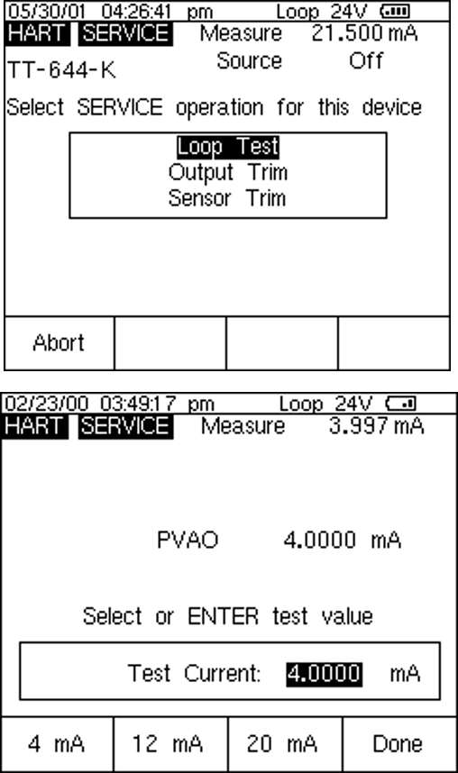 •“Loop test” sets the transmitter output to a specified 4-20 mA output signal by issuing a PVOA command