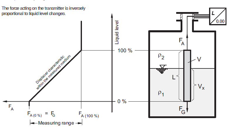 This displacer level transmitter works on Archimedes Principal which states that anybody immersed in liquid is subjected to Archimedes buoyancy force, which is used to determine liquid of level, density and interface.